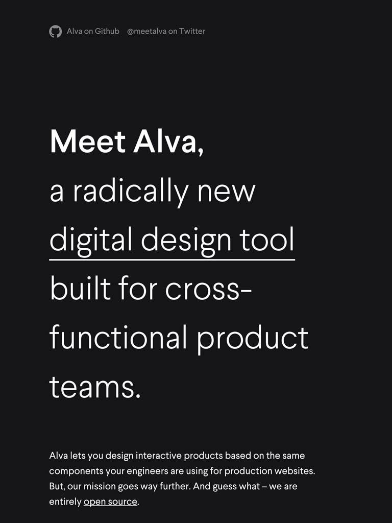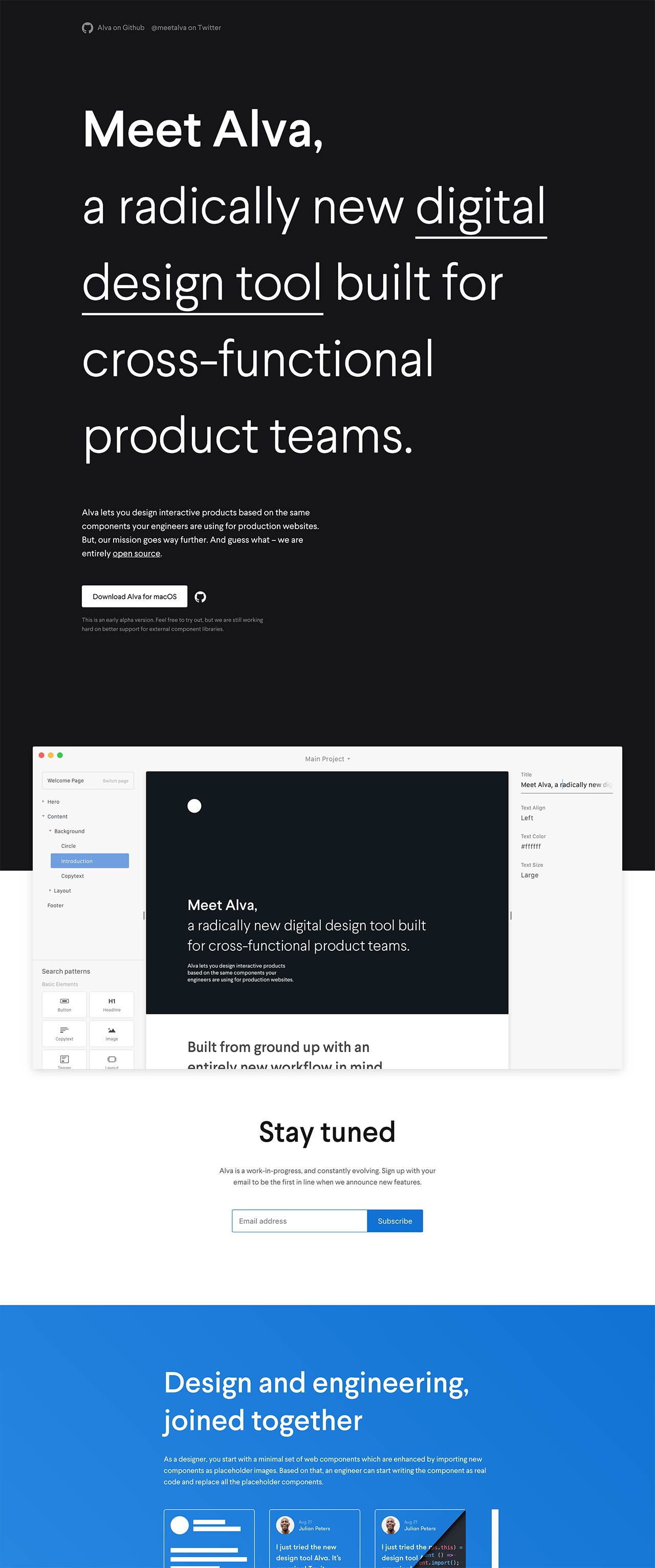 Alva is a radically new digital design tool built for cross-functional product teams. It lets you build components right in the design views and also allows developers to use the same components for live production codings.